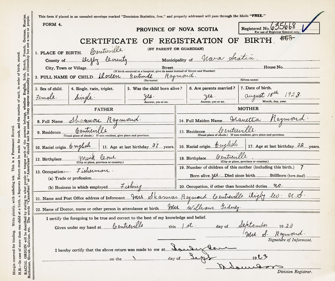 Female Birth Registration: Year: 1923 number: 63500668