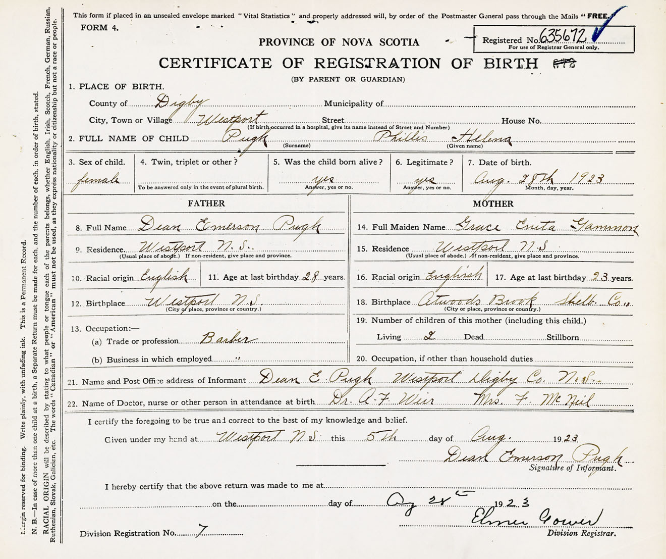 Female Birth Registration: Year: 1923 number: 63500672