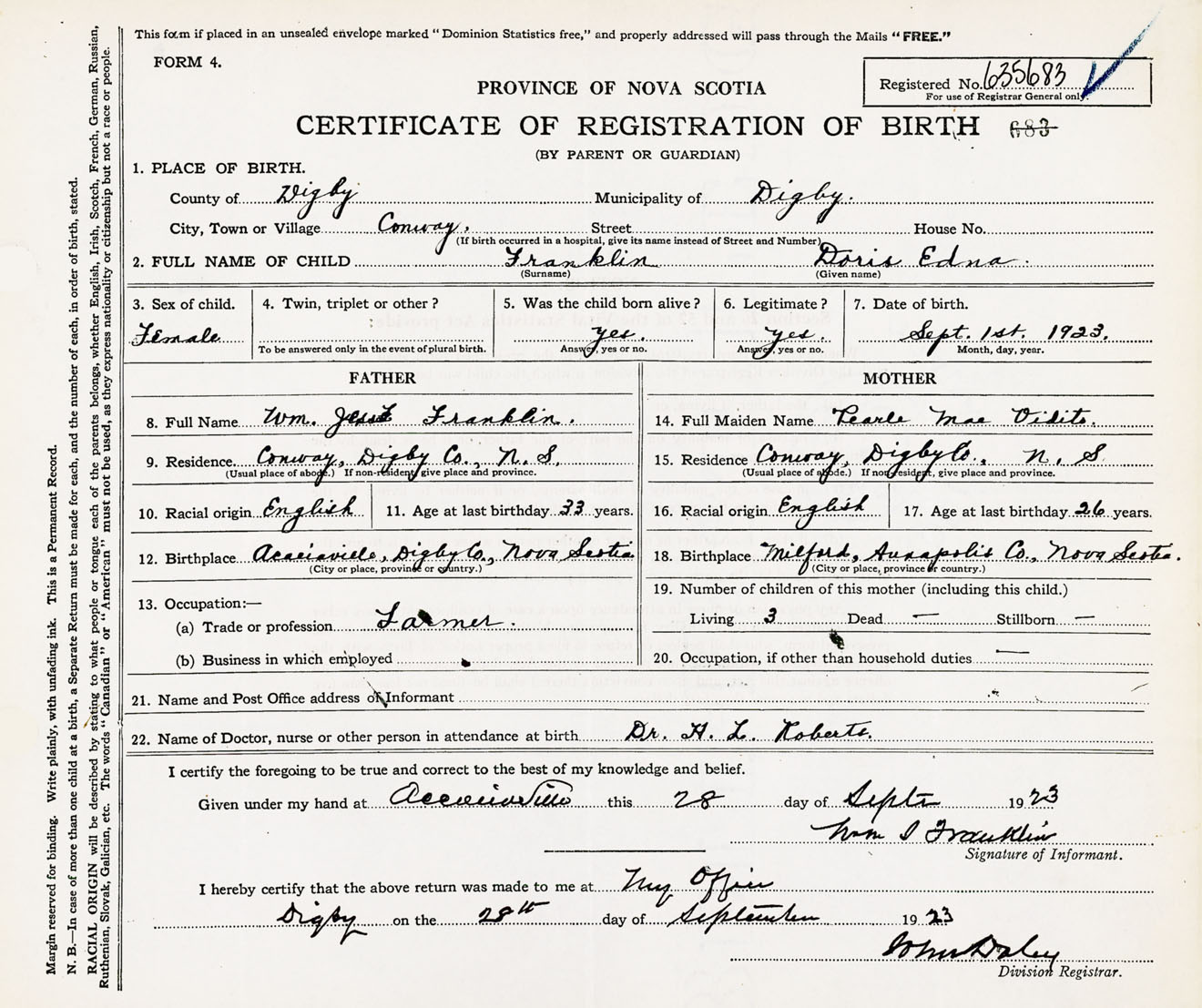 Female Birth Registration: Year: 1923 number: 63500683