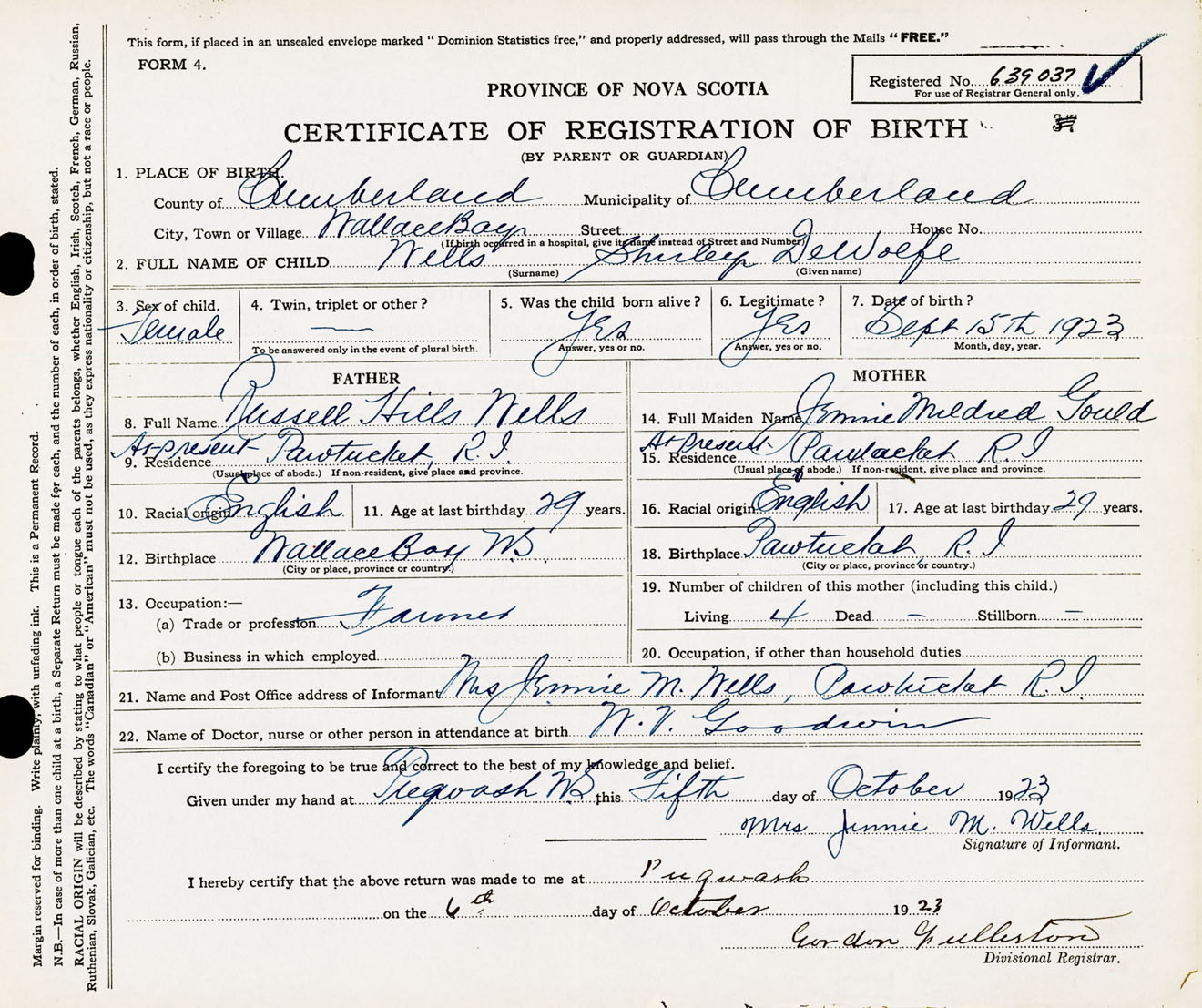 Female Birth Registration: Year: 1923 number: 63900037