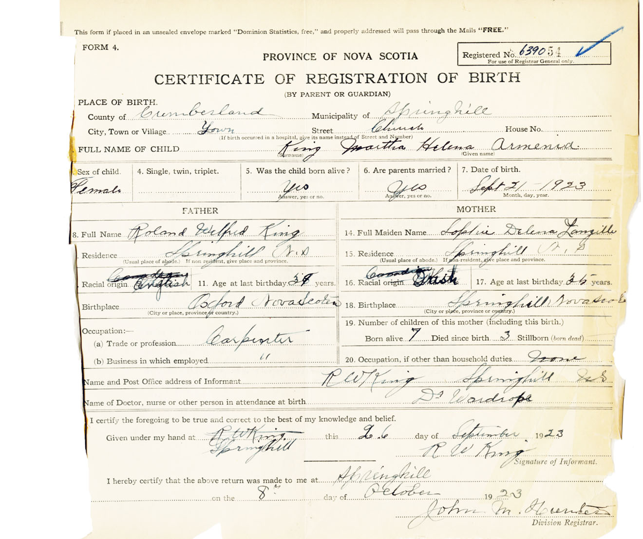 Female Birth Registration: Year: 1923 number: 63900054