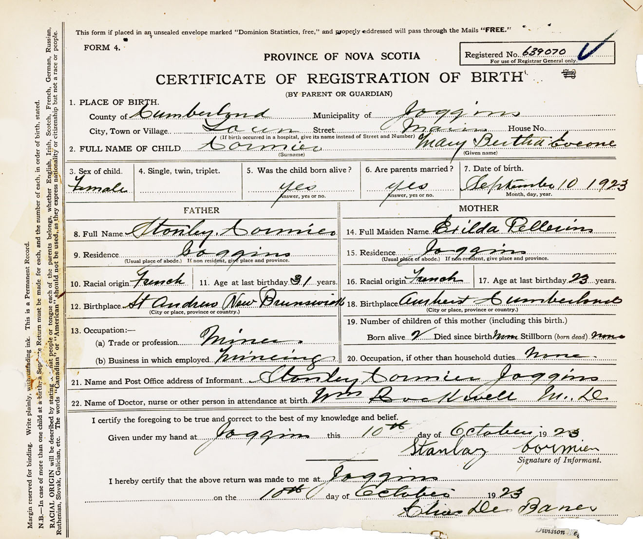 Female Birth Registration: Year: 1923 number: 63900070