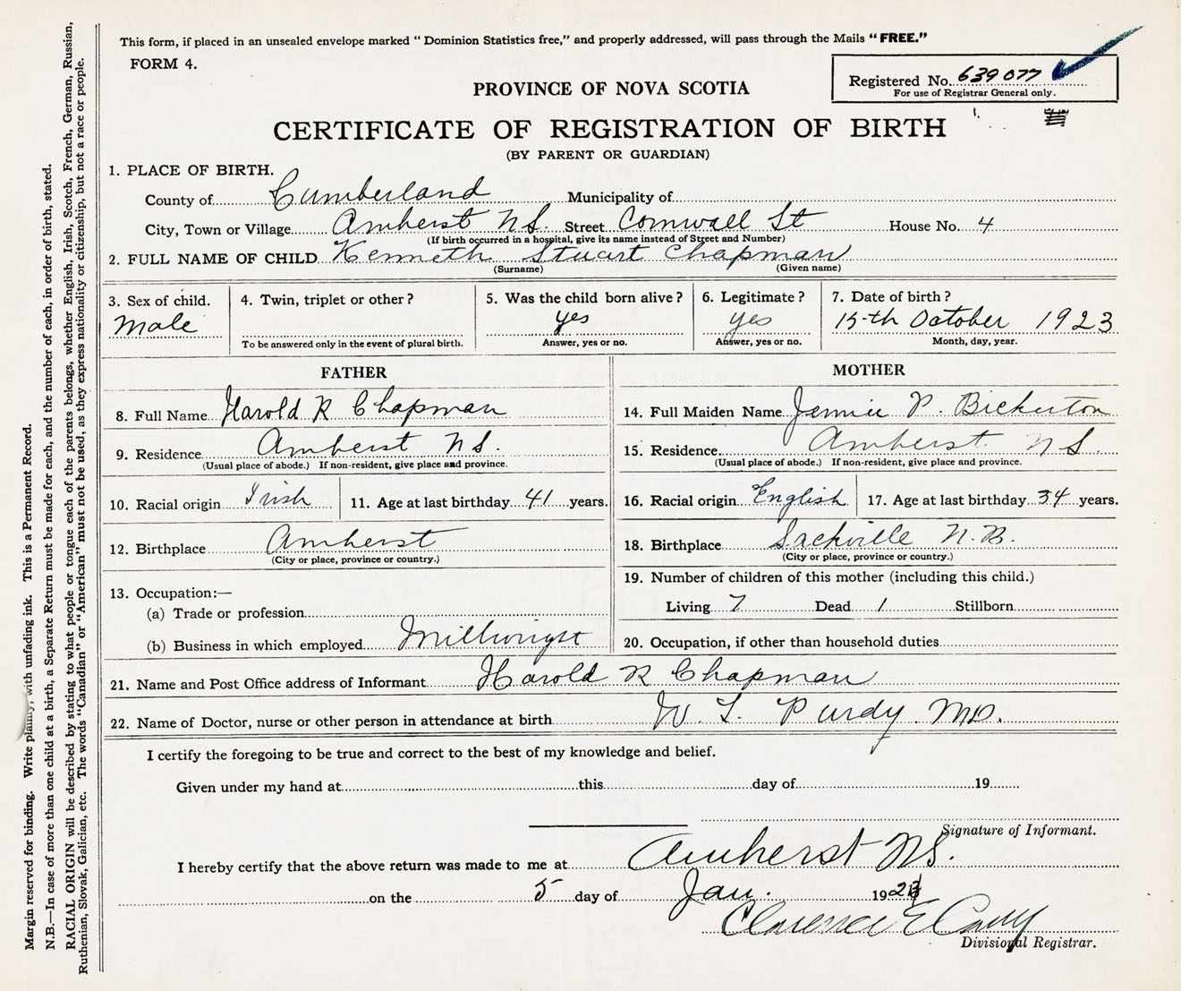 Male Birth Registration: Year: 1923 number: 63900077