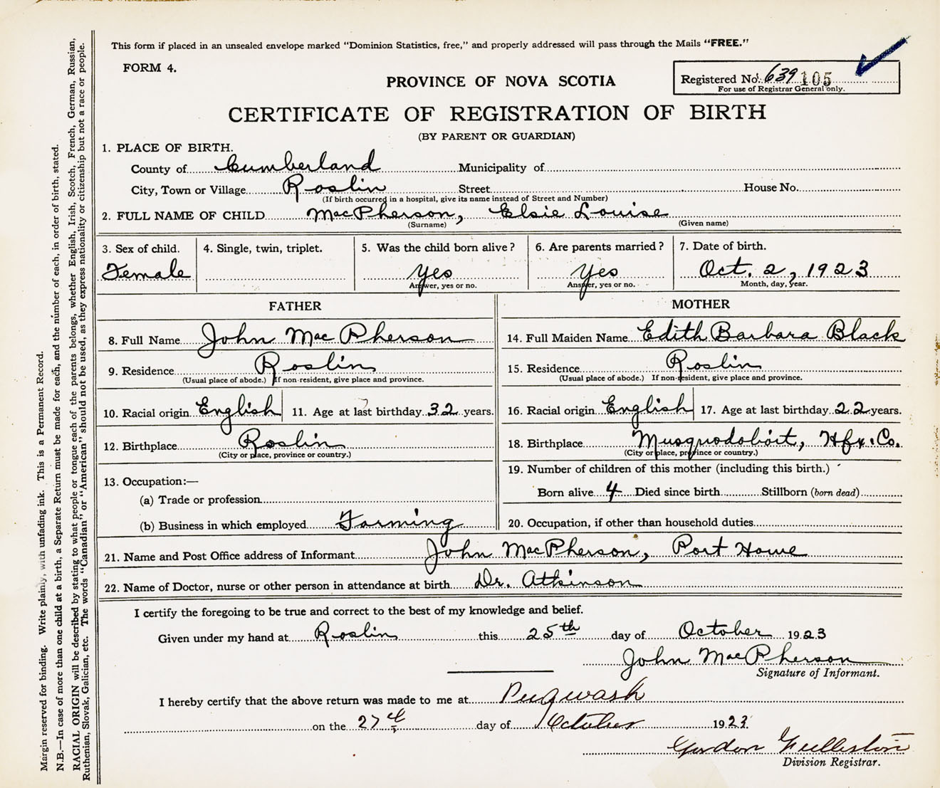 Female Birth Registration: Year: 1923 number: 63900105
