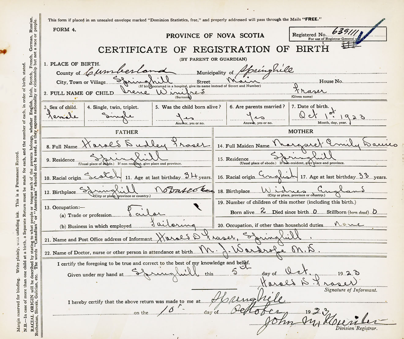 Female Birth Registration: Year: 1923 number: 63900111