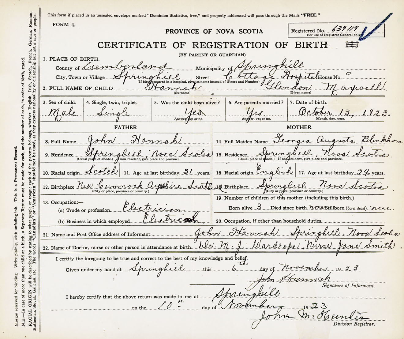 Male Birth Registration: Year: 1923 number: 63900119
