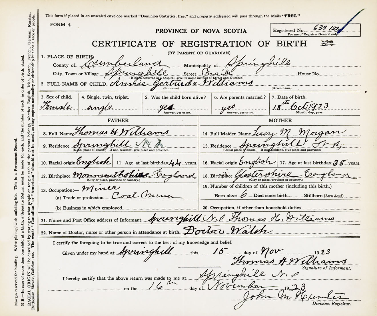 Female Birth Registration: Year: 1923 number: 63900122
