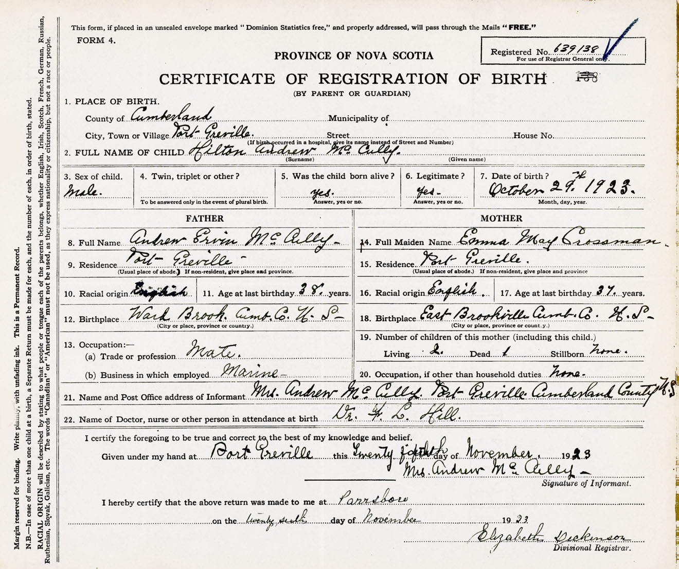 Male Birth Registration: Year: 1923 number: 63900138