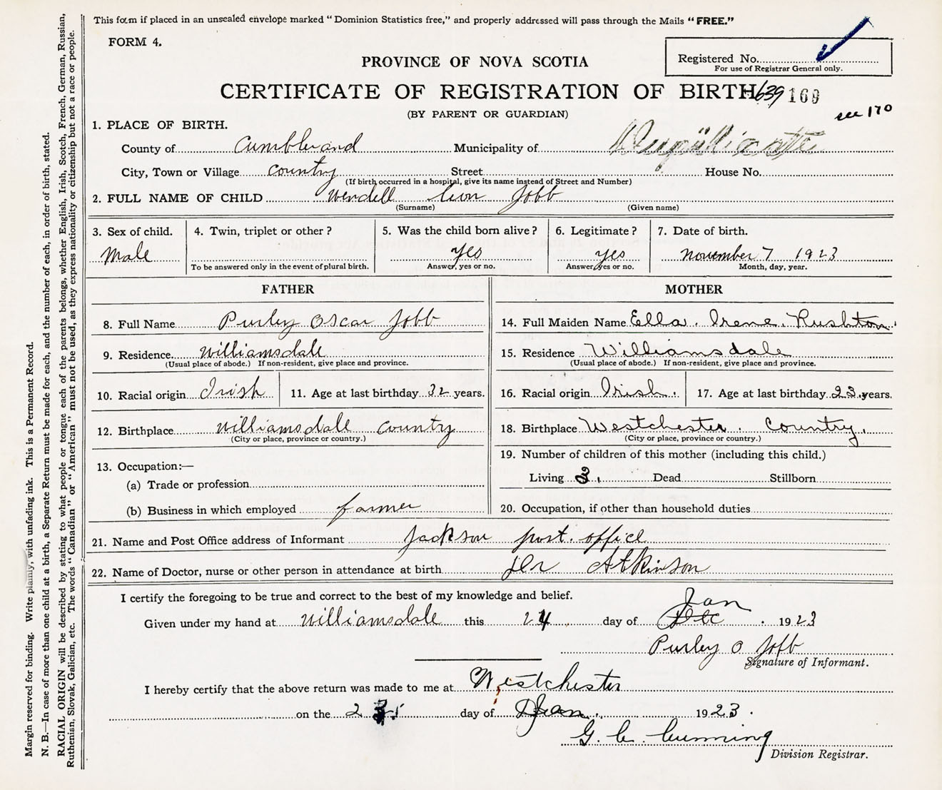 Male Birth Registration: Year: 1923 number: 63900169
