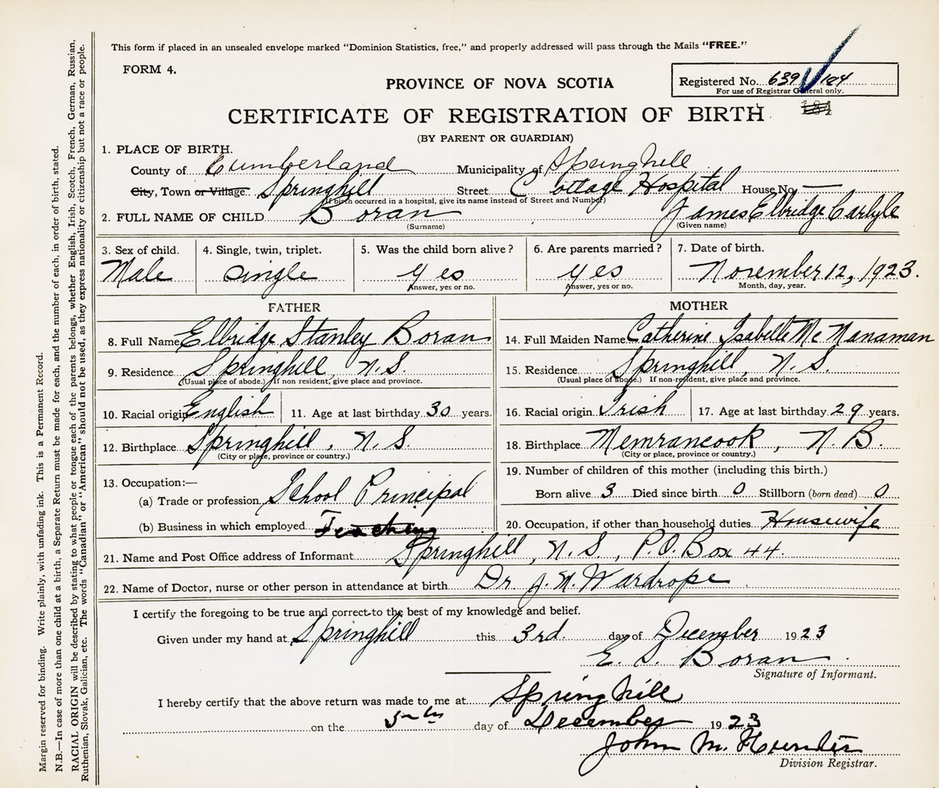 Male Birth Registration: Year: 1923 number: 63900184