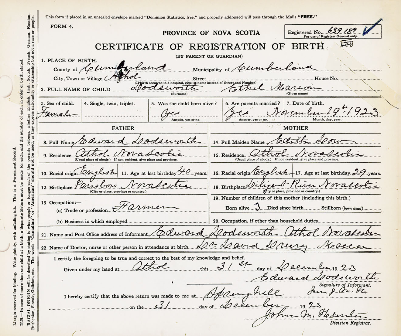 Female Birth Registration: Year: 1923 number: 63900189