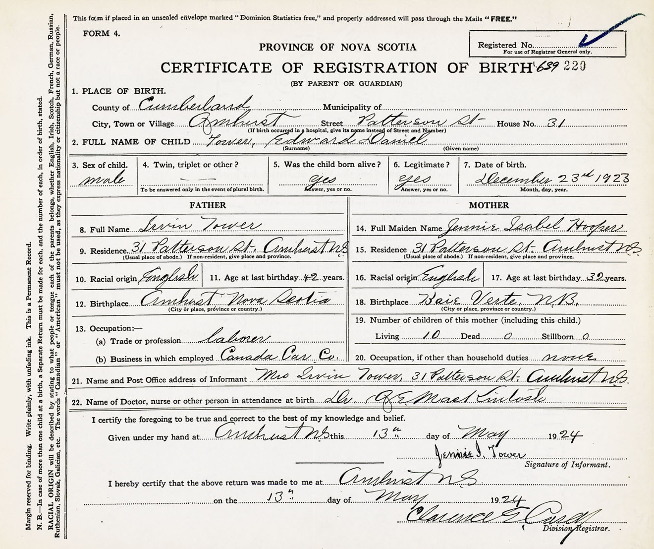 Male Birth Registration: Year: 1923 number: 63900220