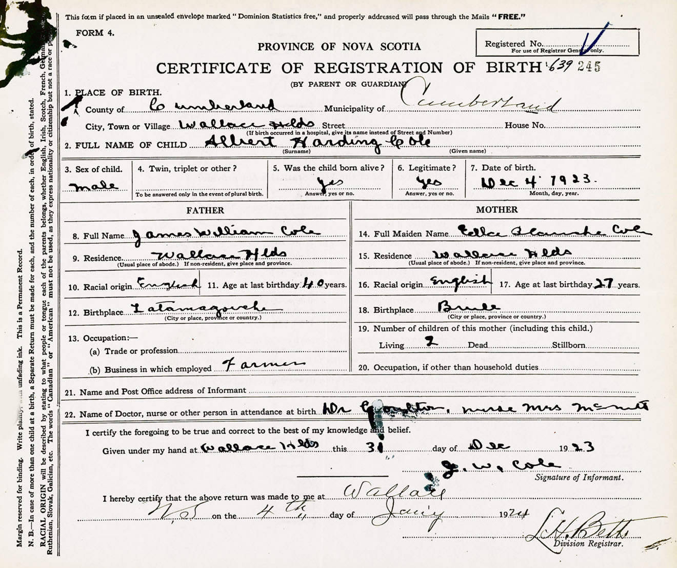 Male Birth Registration: Year: 1923 number: 63900245