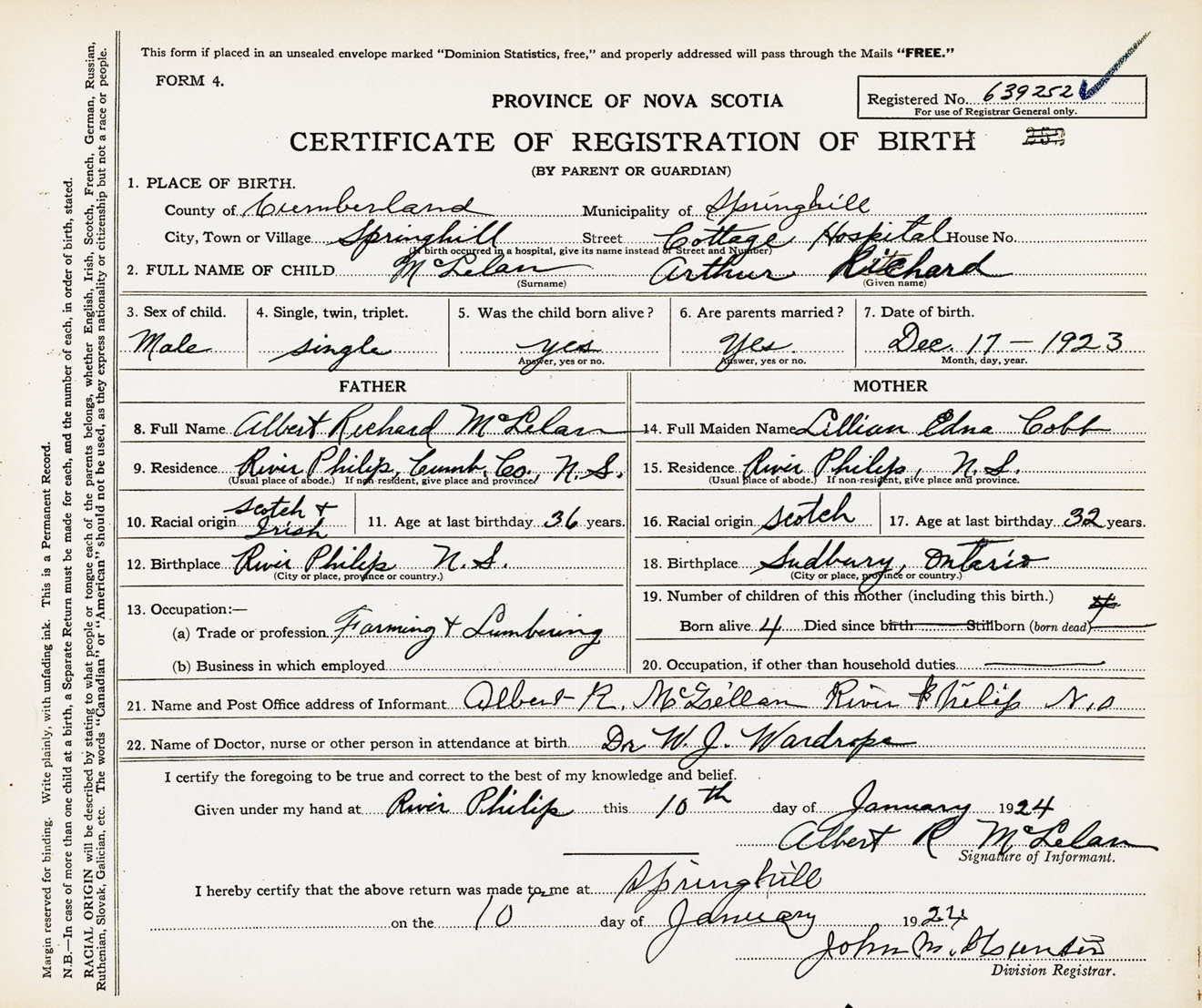 Male Birth Registration: Year: 1923 number: 63900252