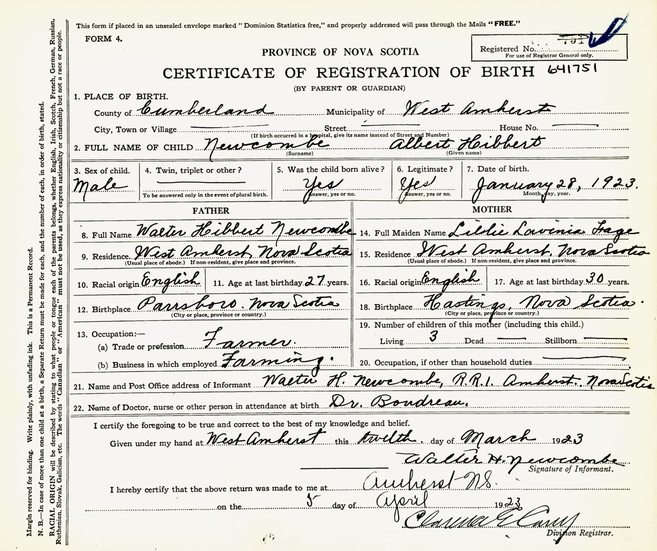 Male Birth Registration: Year: 1923 number: 64100751