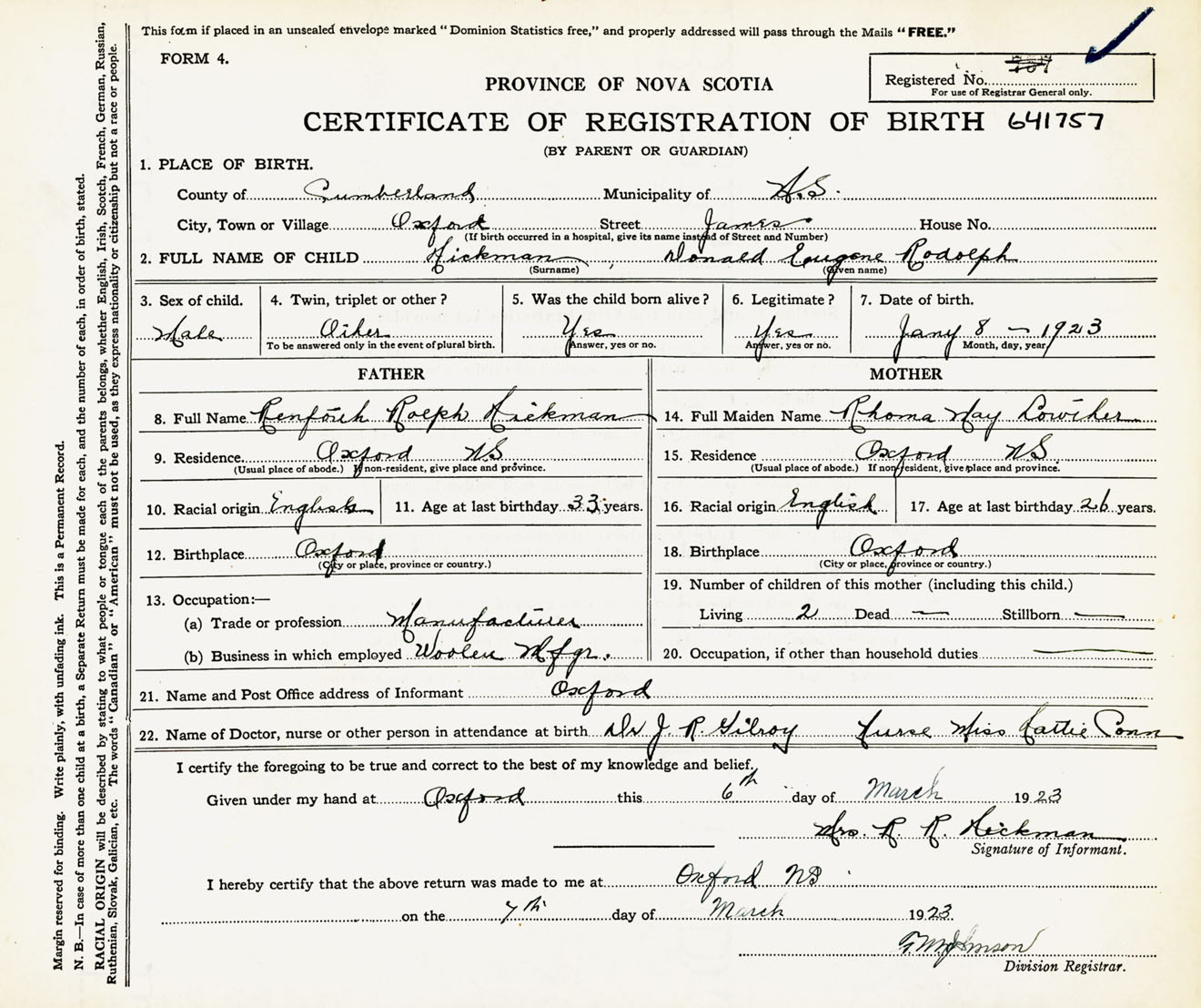 Male Birth Registration: Year: 1923 number: 64100757