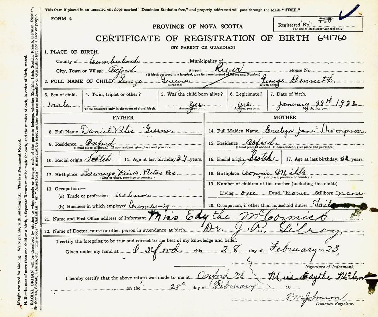 Male Birth Registration: Year: 1923 number: 64100760