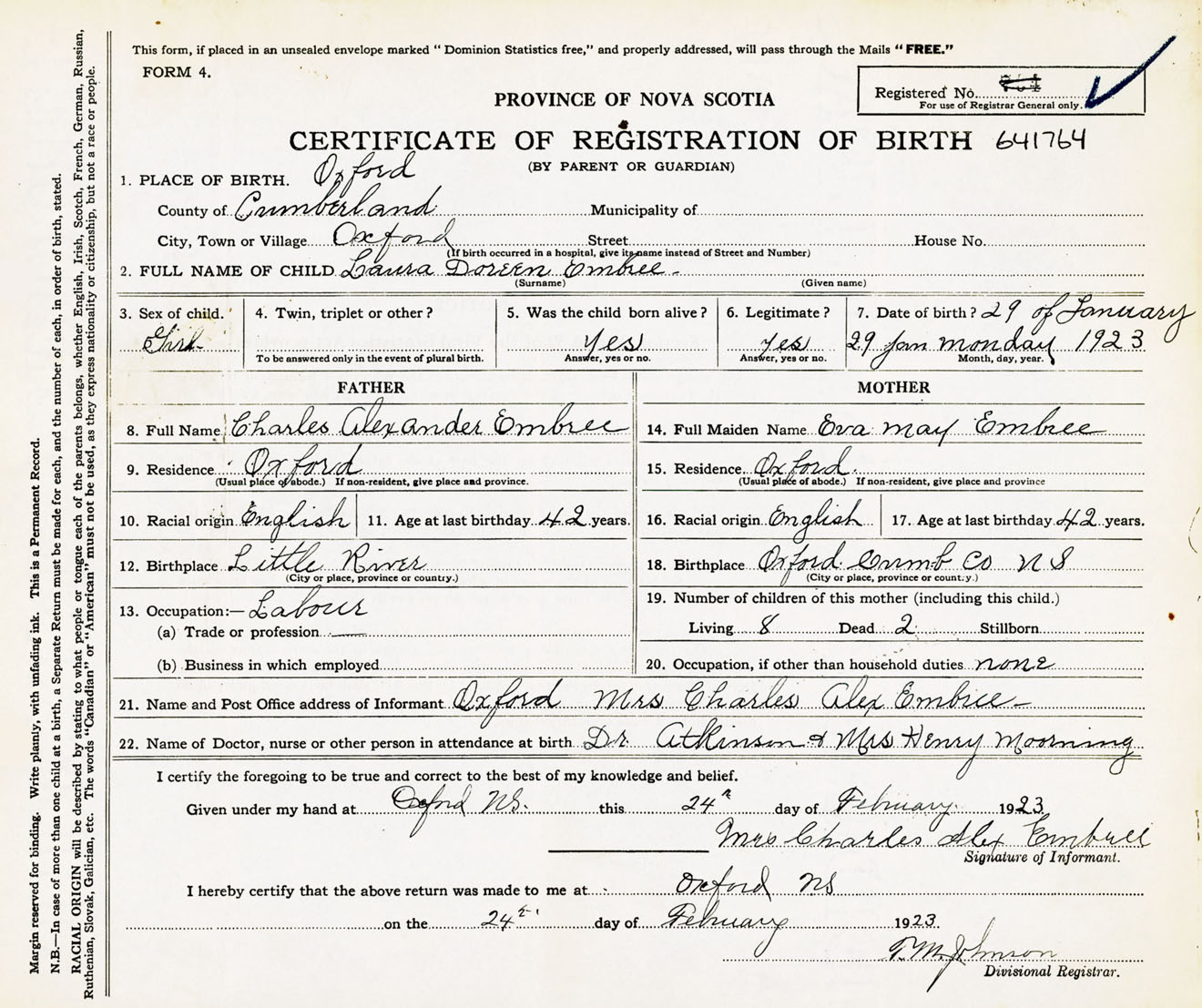 Female Birth Registration: Year: 1923 number: 64100764
