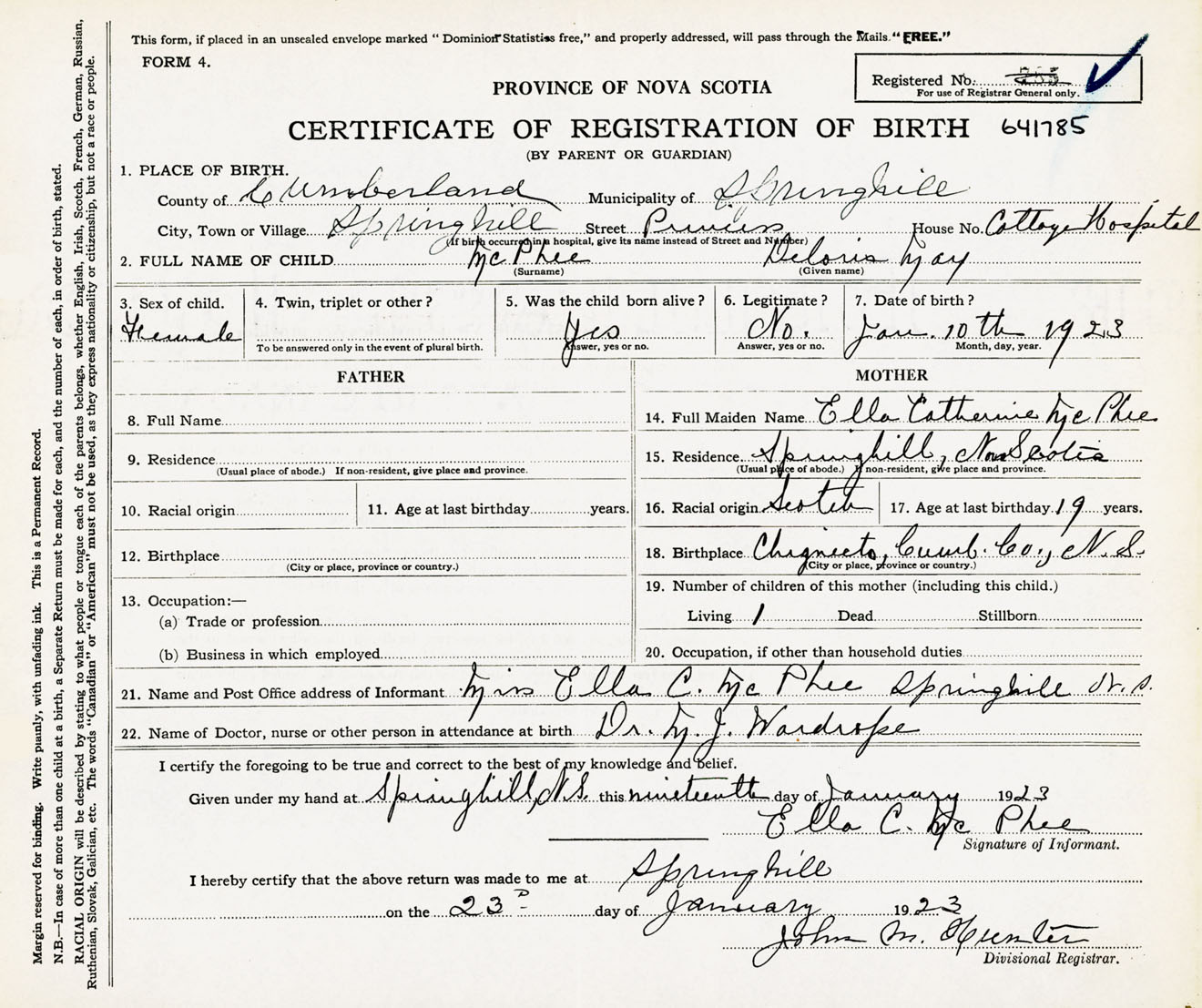 Female Birth Registration: Year: 1923 number: 64100785