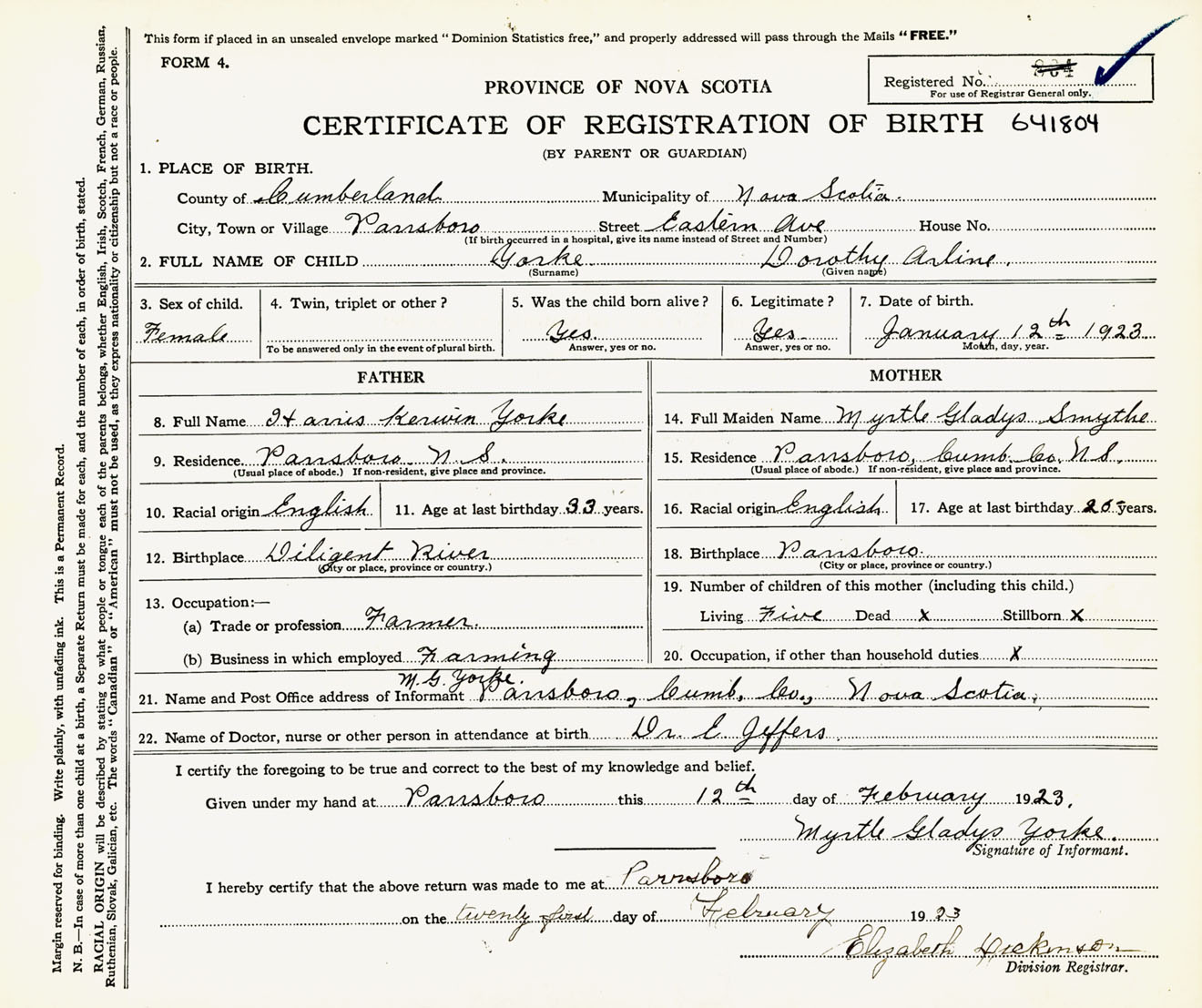 Female Birth Registration: Year: 1923 number: 64100804