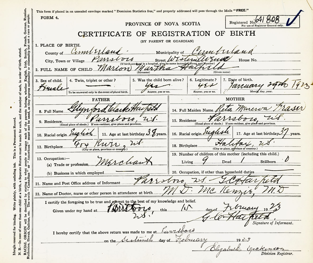 Female Birth Registration: Year: 1923 number: 64100808
