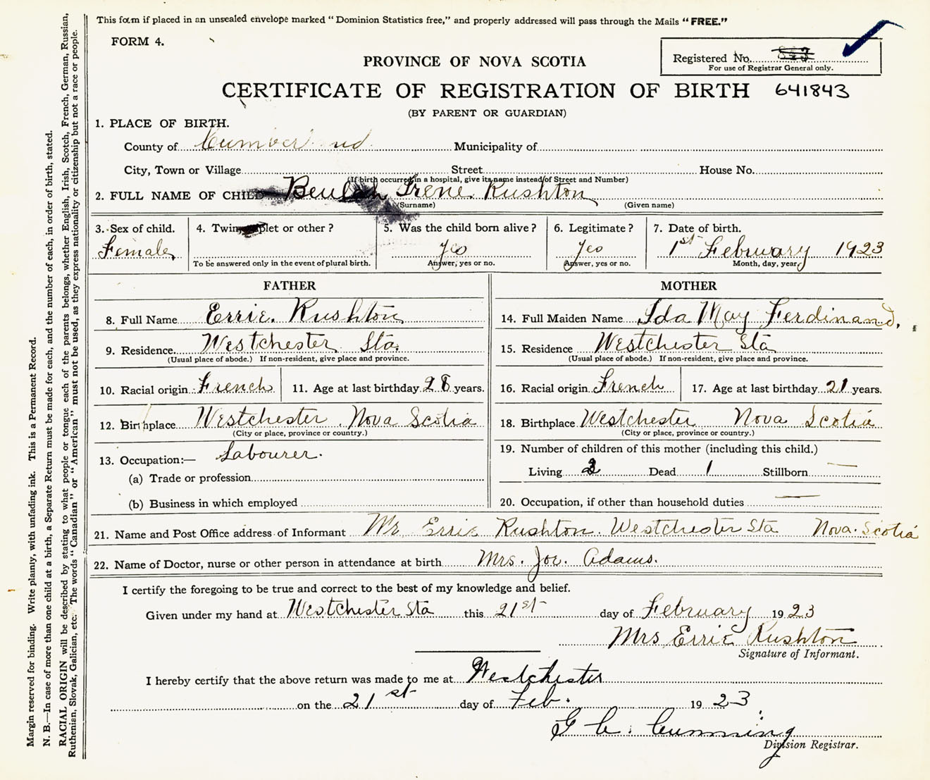 Female Birth Registration: Year: 1923 number: 64100843