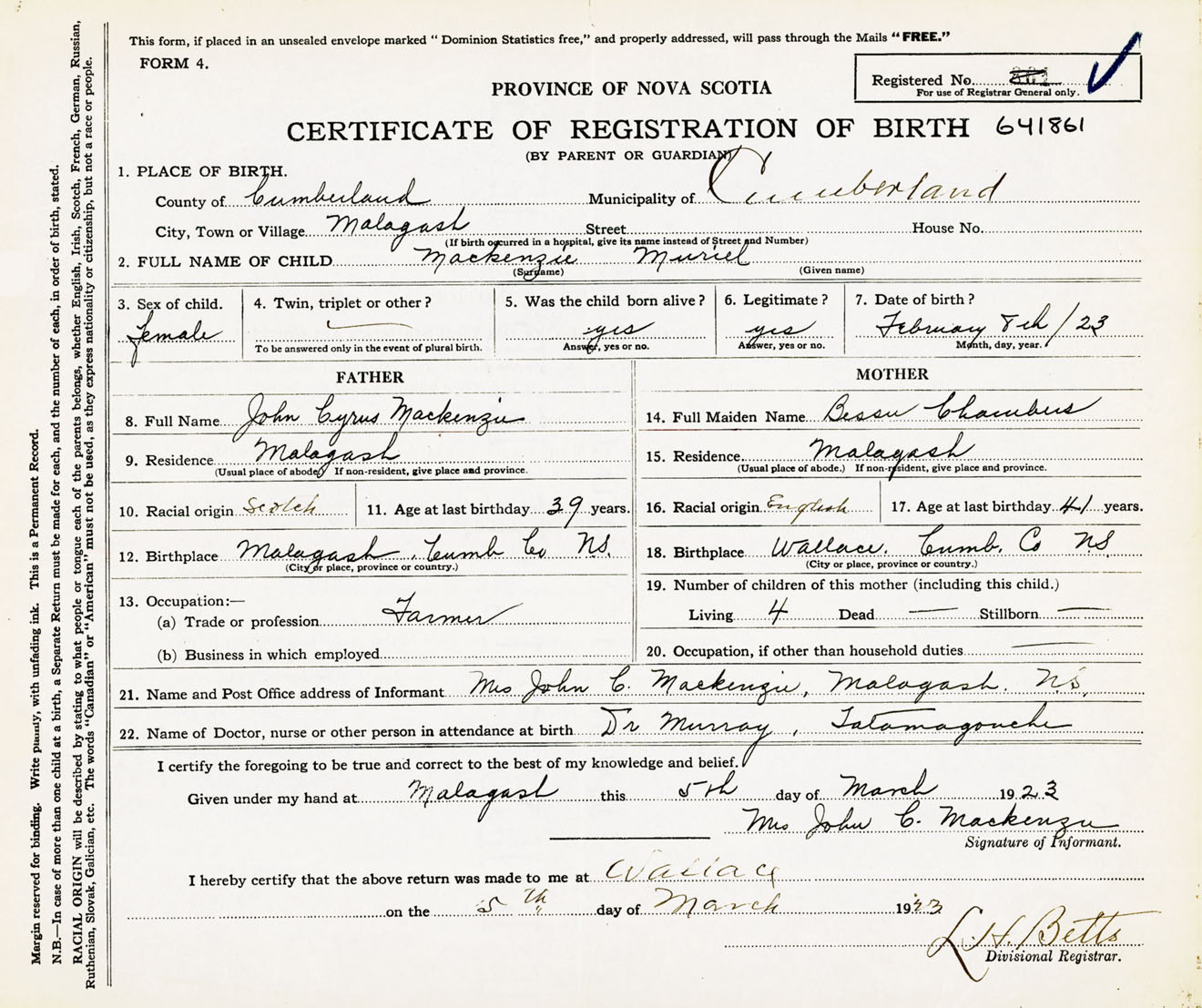 Female Birth Registration: Year: 1923 number: 64100861