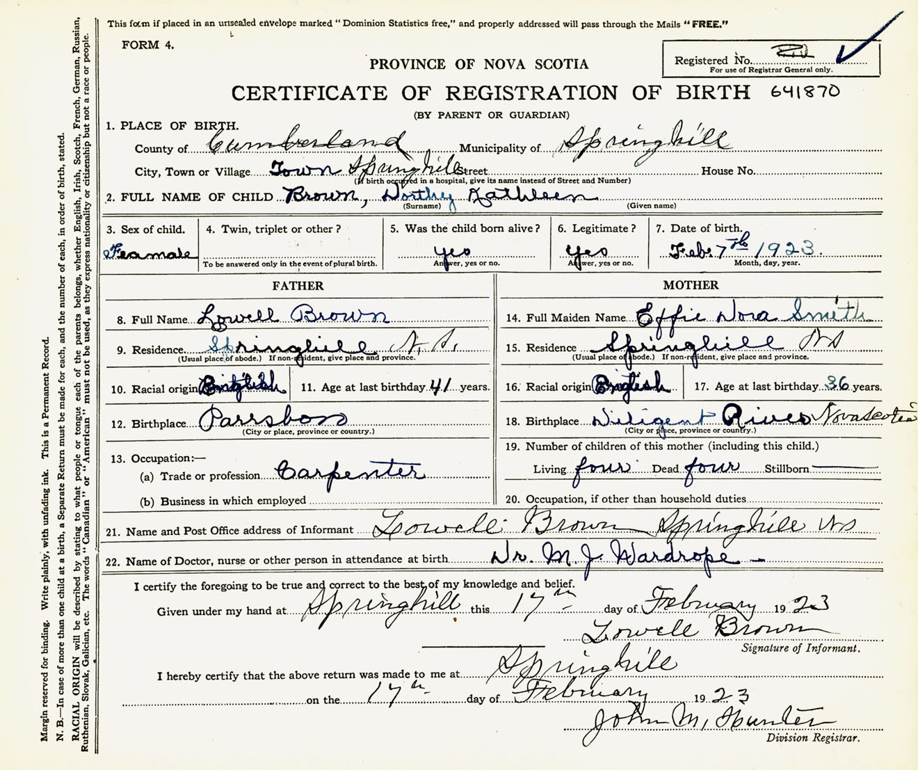 Female Birth Registration: Year: 1923 number: 64100870