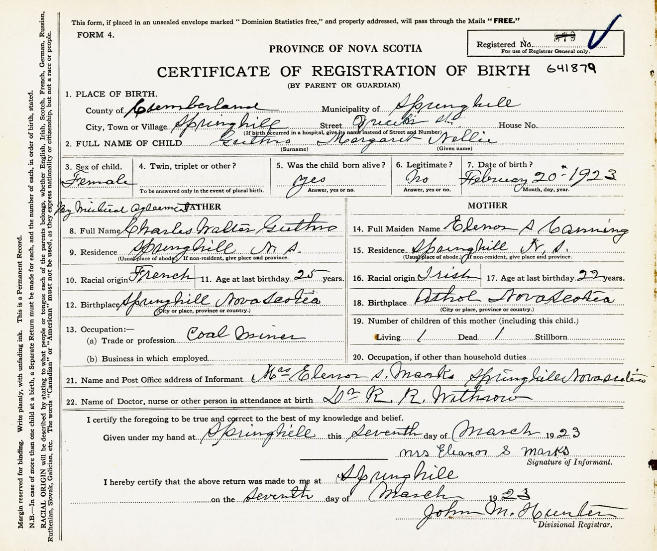Female Birth Registration: Year: 1923 number: 64100879