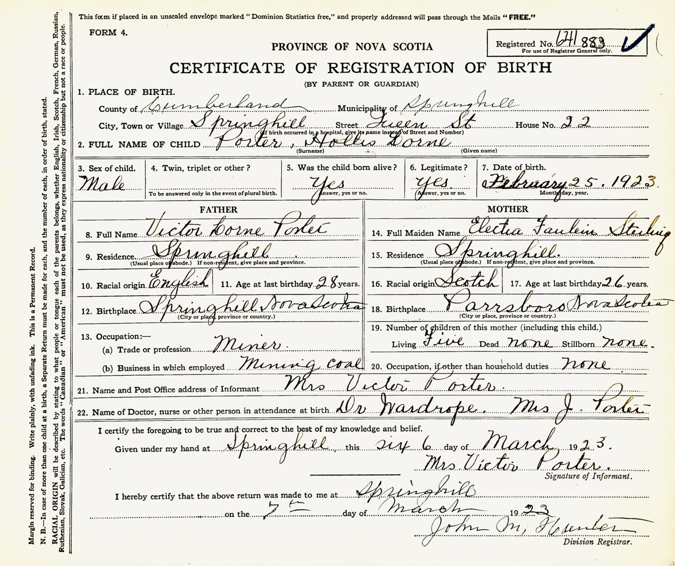 Male Birth Registration: Year: 1923 number: 64100883