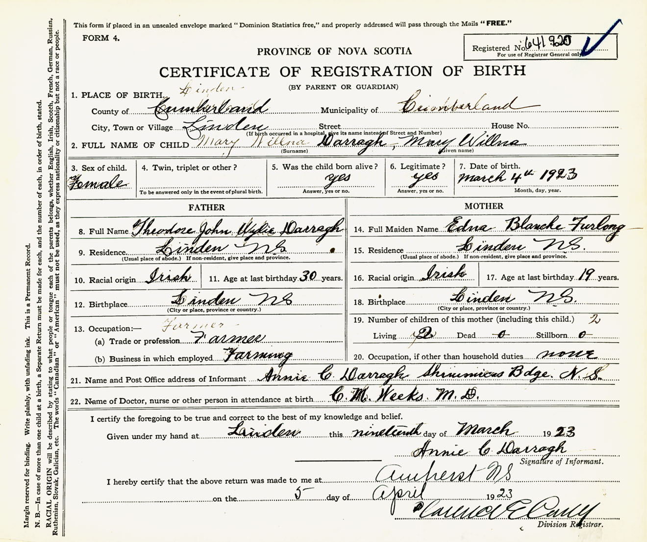 Female Birth Registration: Year: 1923 number: 64100920