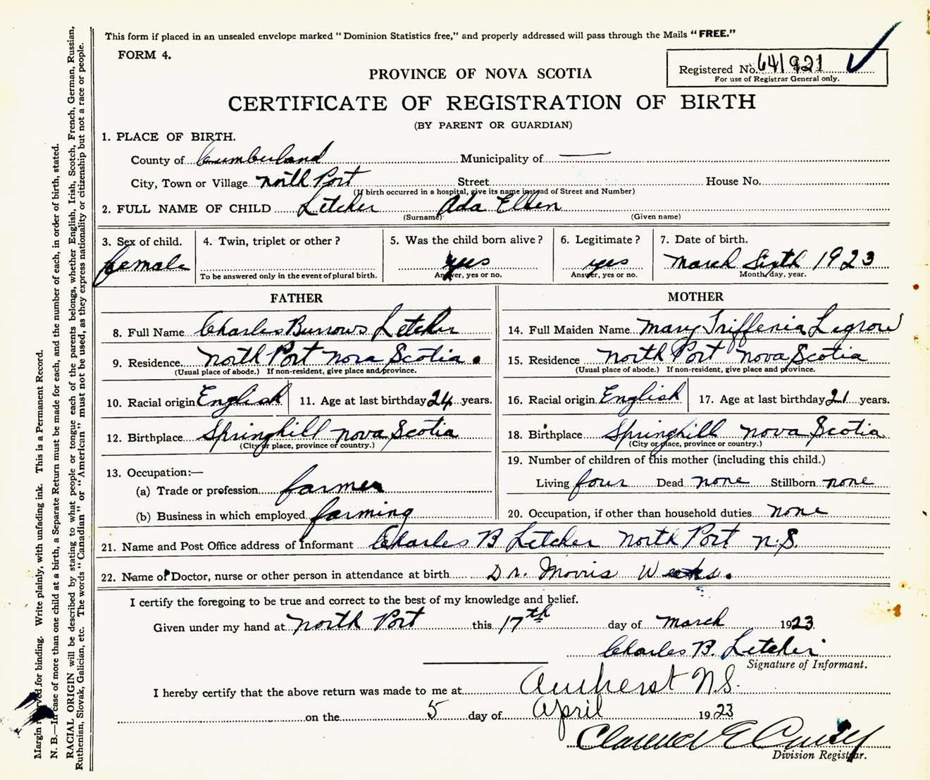 Female Birth Registration: Year: 1923 number: 64100921