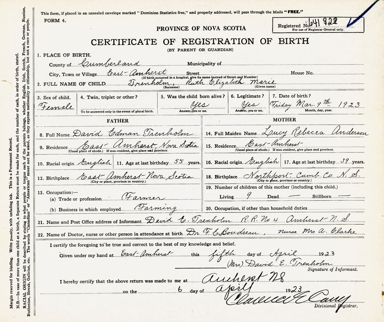 Female Birth Registration: Year: 1923 number: 64100922