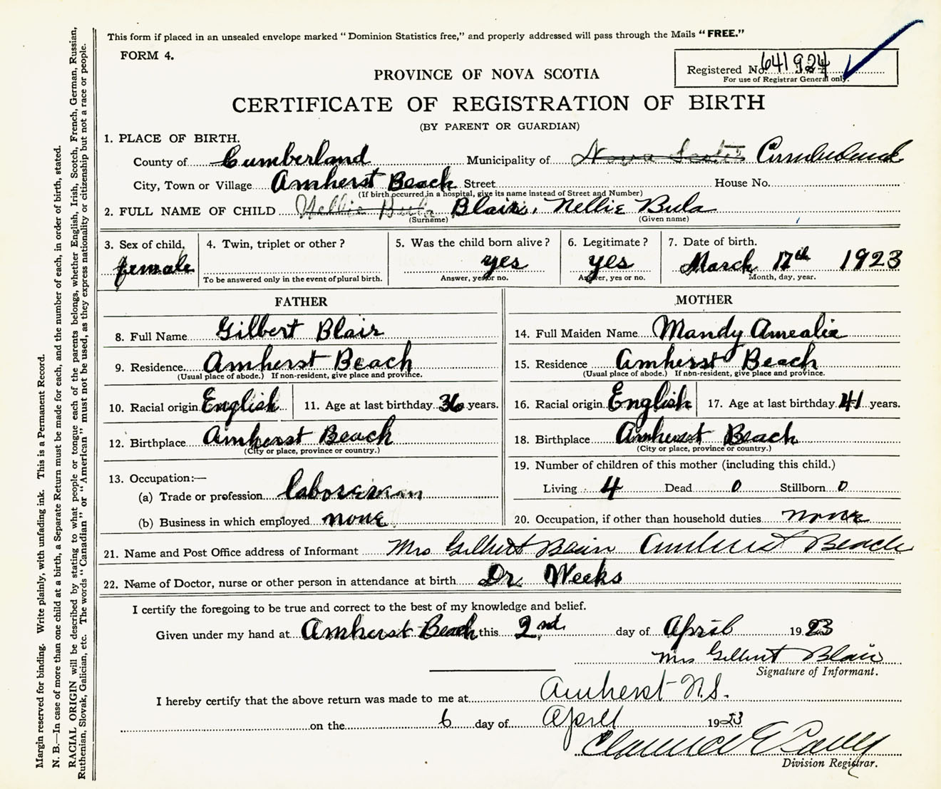 Female Birth Registration: Year: 1923 number: 64100924