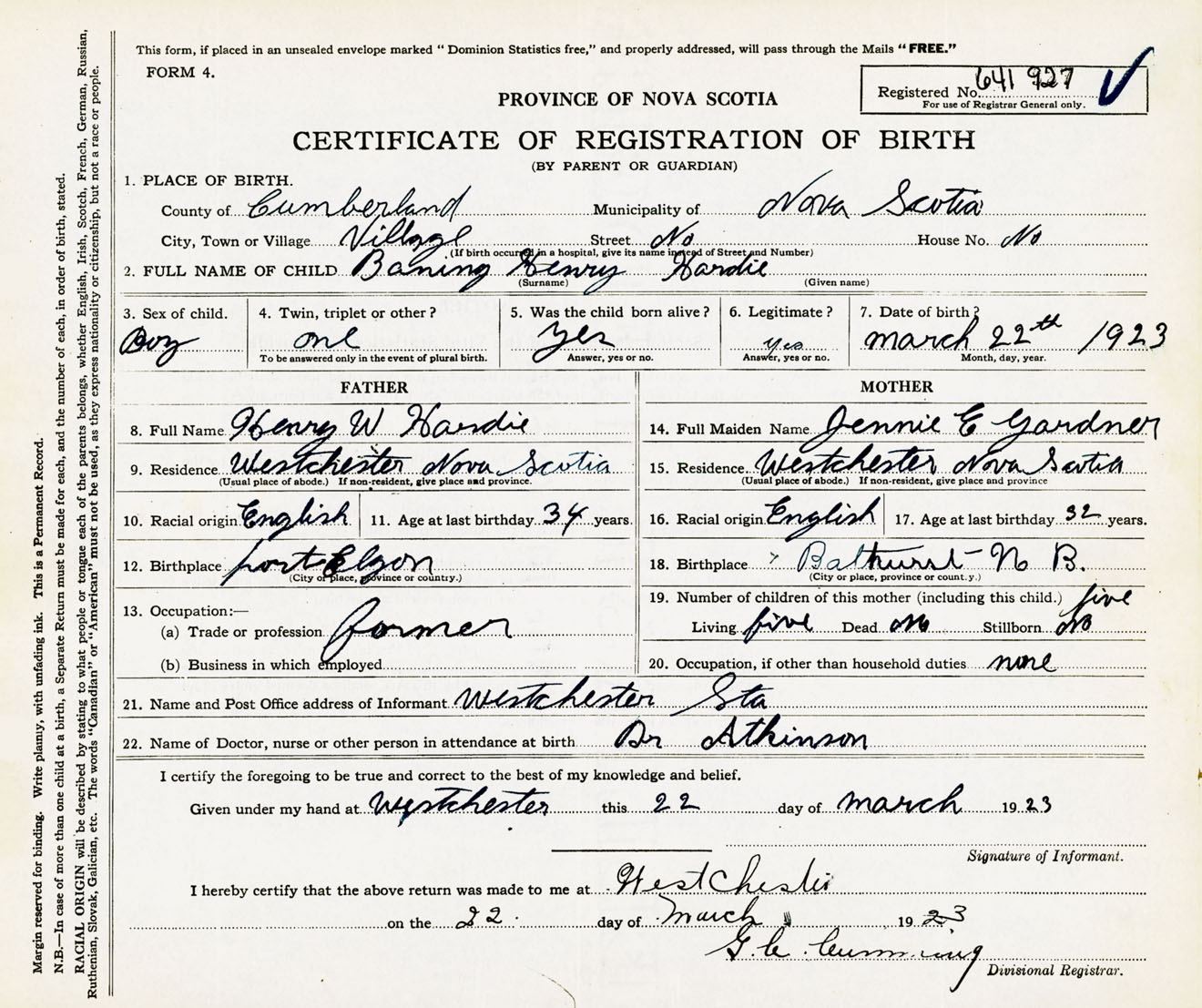 Male Birth Registration: Year: 1923 number: 64100927