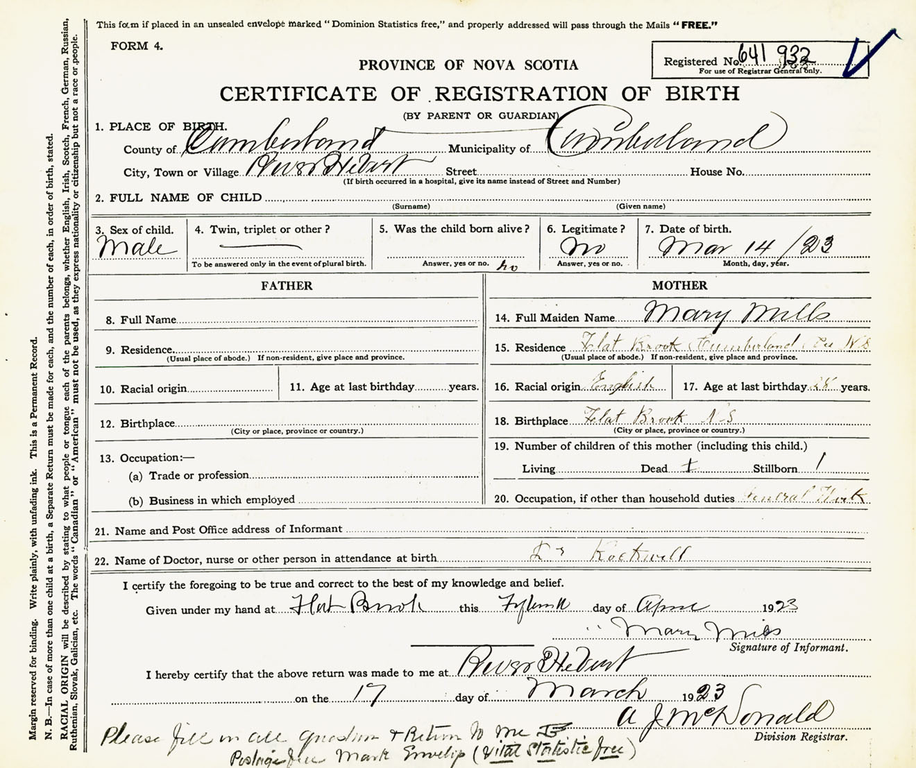 Male Birth Registration: Year: 1923 number: 64100932
