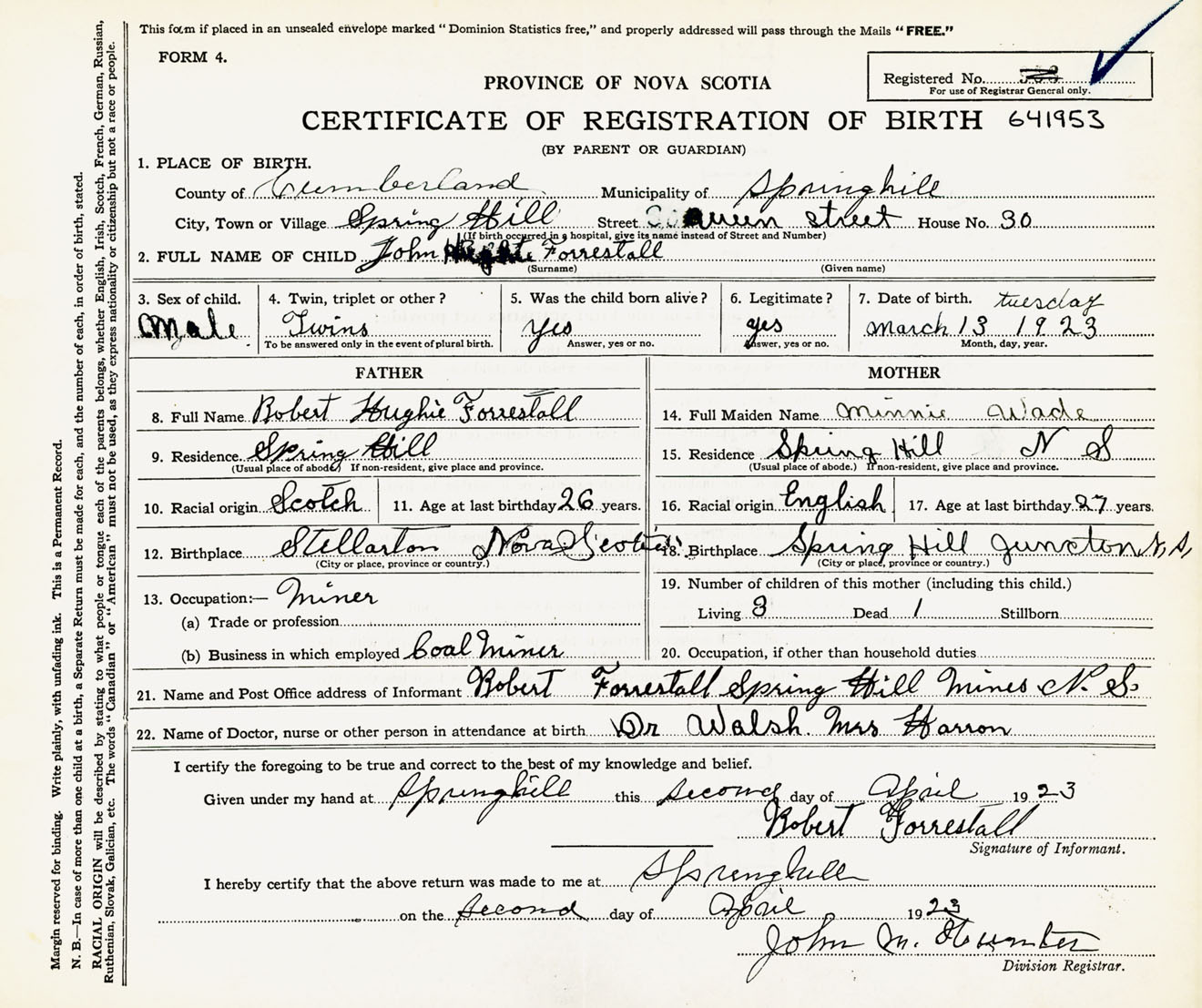 Male Birth Registration: Year: 1923 number: 64100953