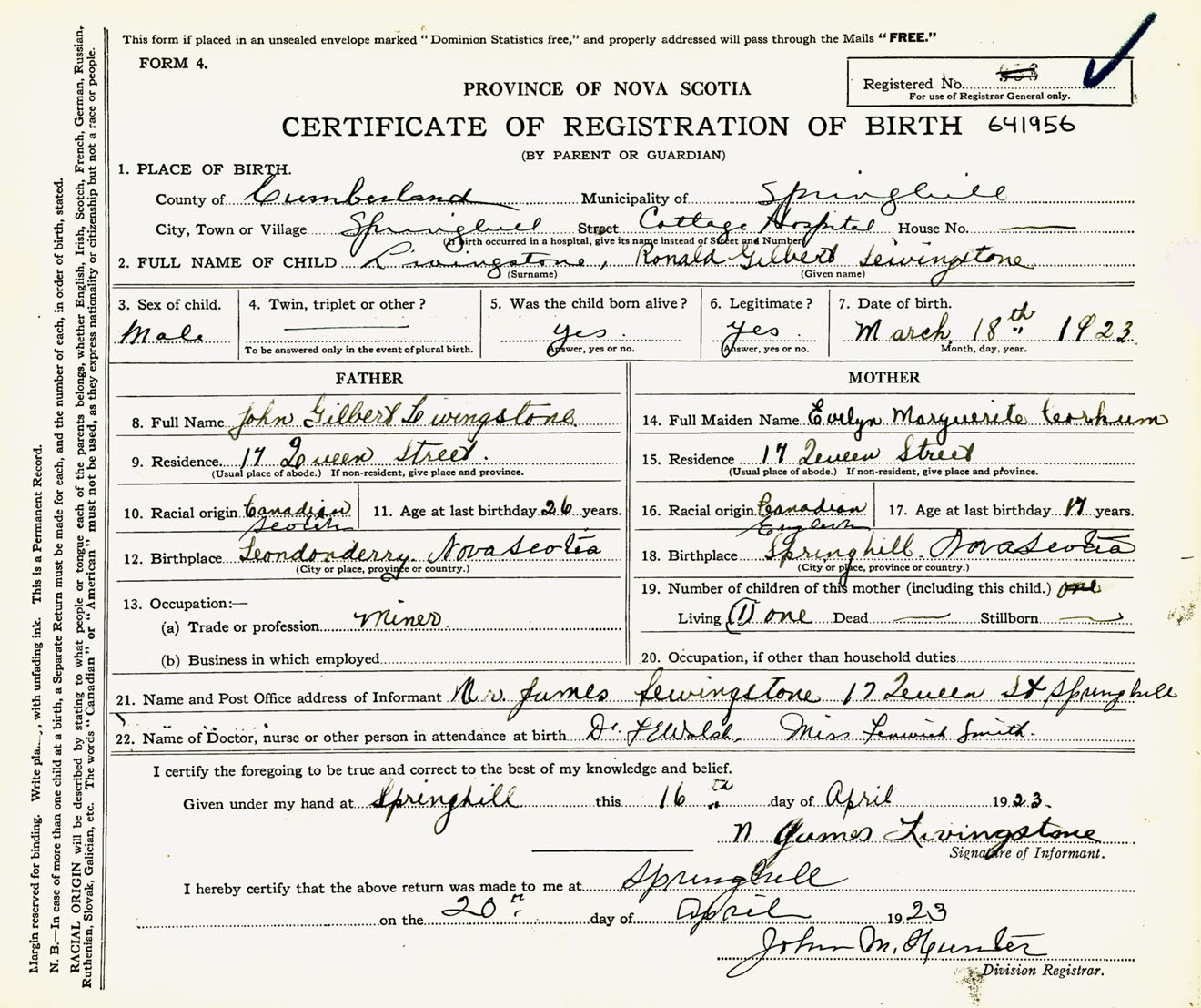 Male Birth Registration: Year: 1923 number: 64100956