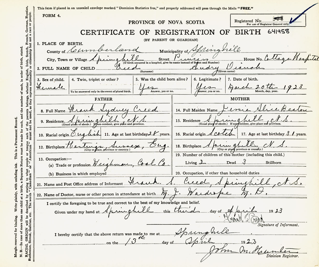 Female Birth Registration: Year: 1923 number: 64100958