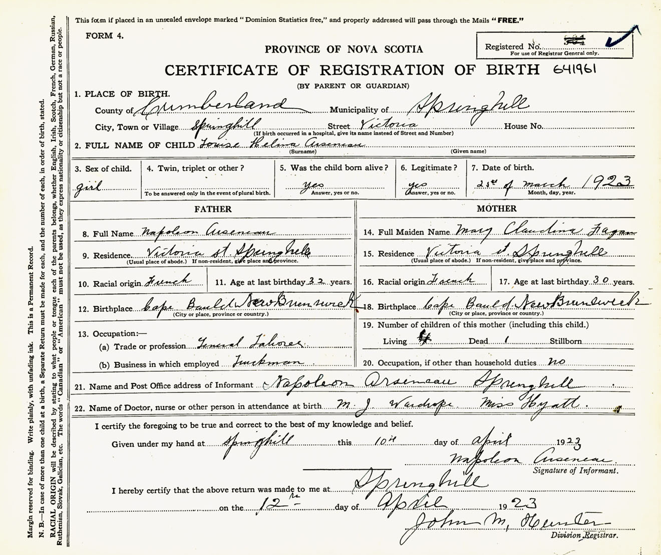 Female Birth Registration: Year: 1923 number: 64100961