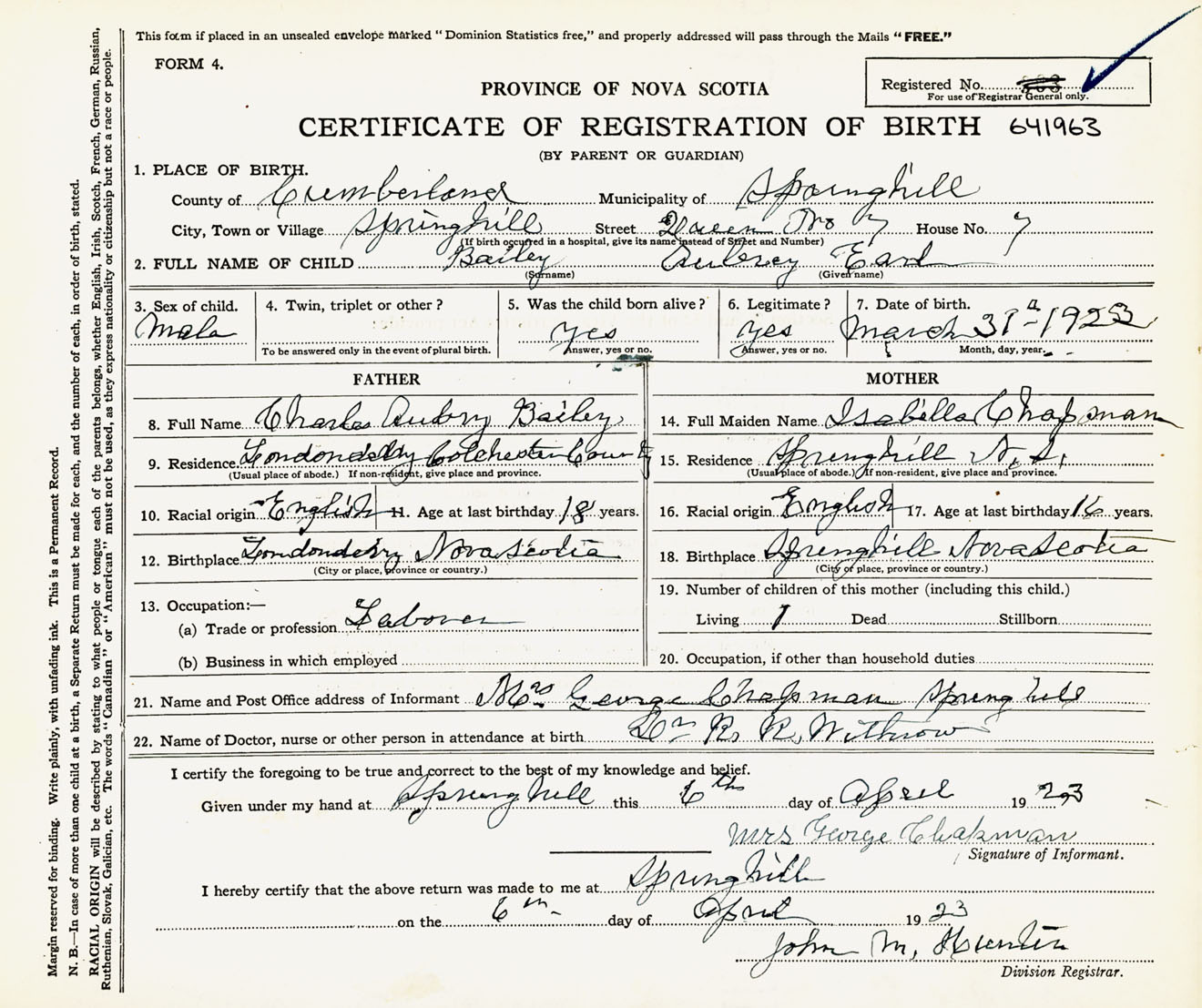 Male Birth Registration: Year: 1923 number: 64100963