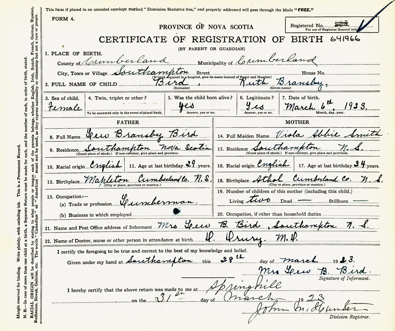 Female Birth Registration: Year: 1923 number: 64100966