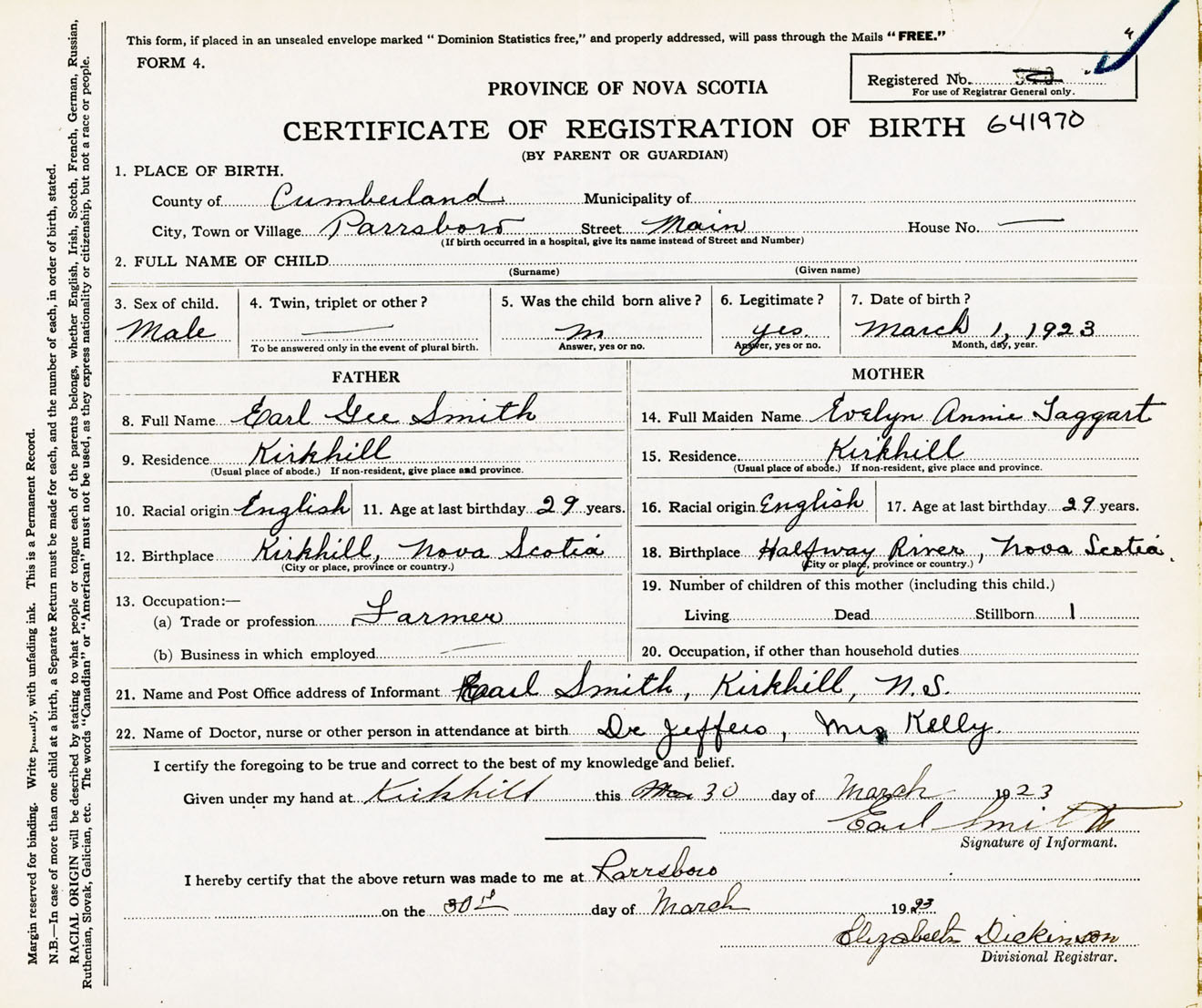 Male Birth Registration: Year: 1923 number: 64100970