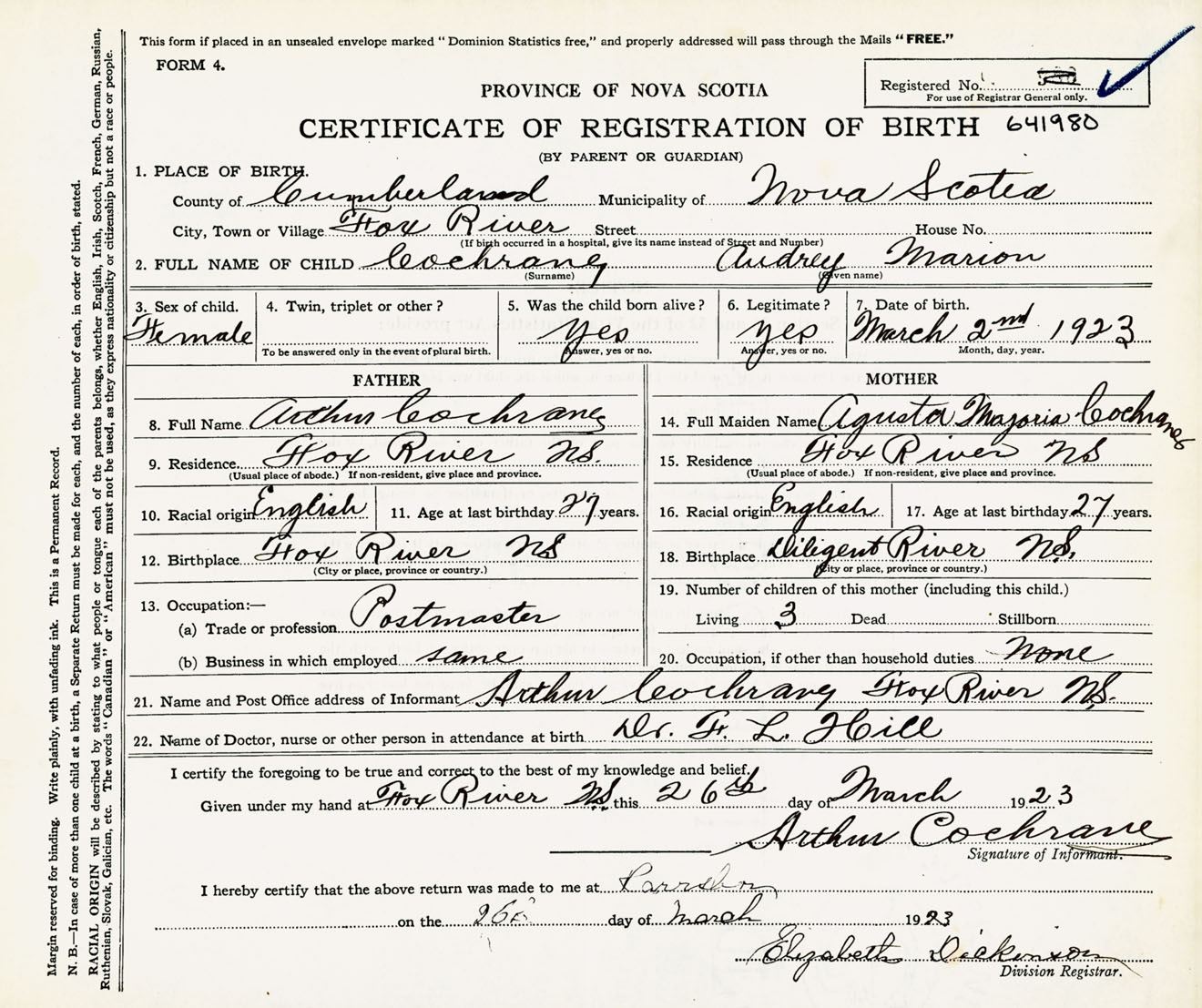 Female Birth Registration: Year: 1923 number: 64100980