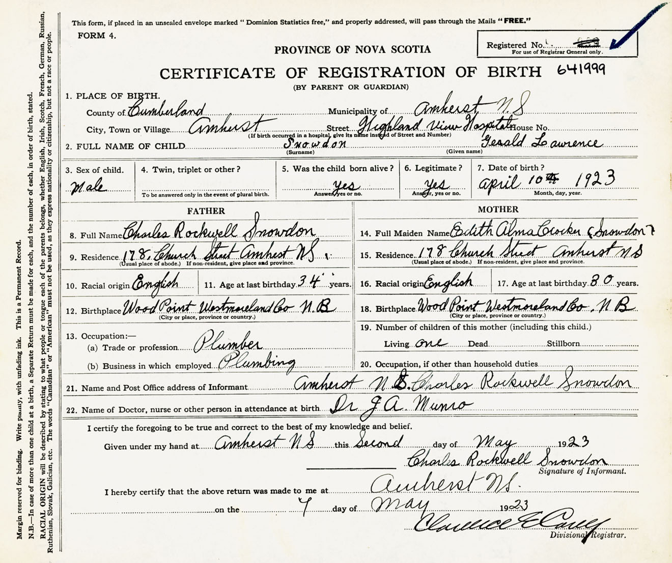 Male Birth Registration: Year: 1923 number: 64100999