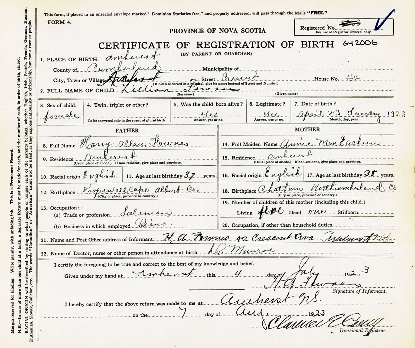 Female Birth Registration: Year: 1923 number: 64200006