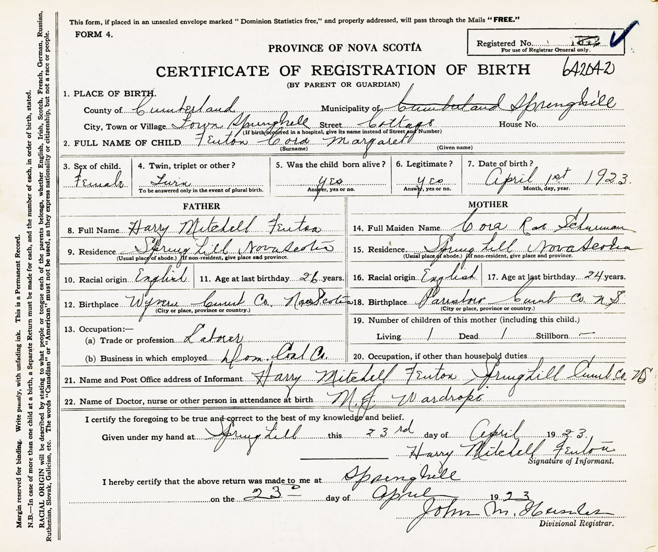 Female Birth Registration: Year: 1923 number: 64200042