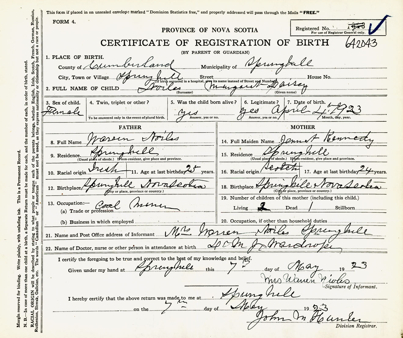 Female Birth Registration: Year: 1923 number: 64200043