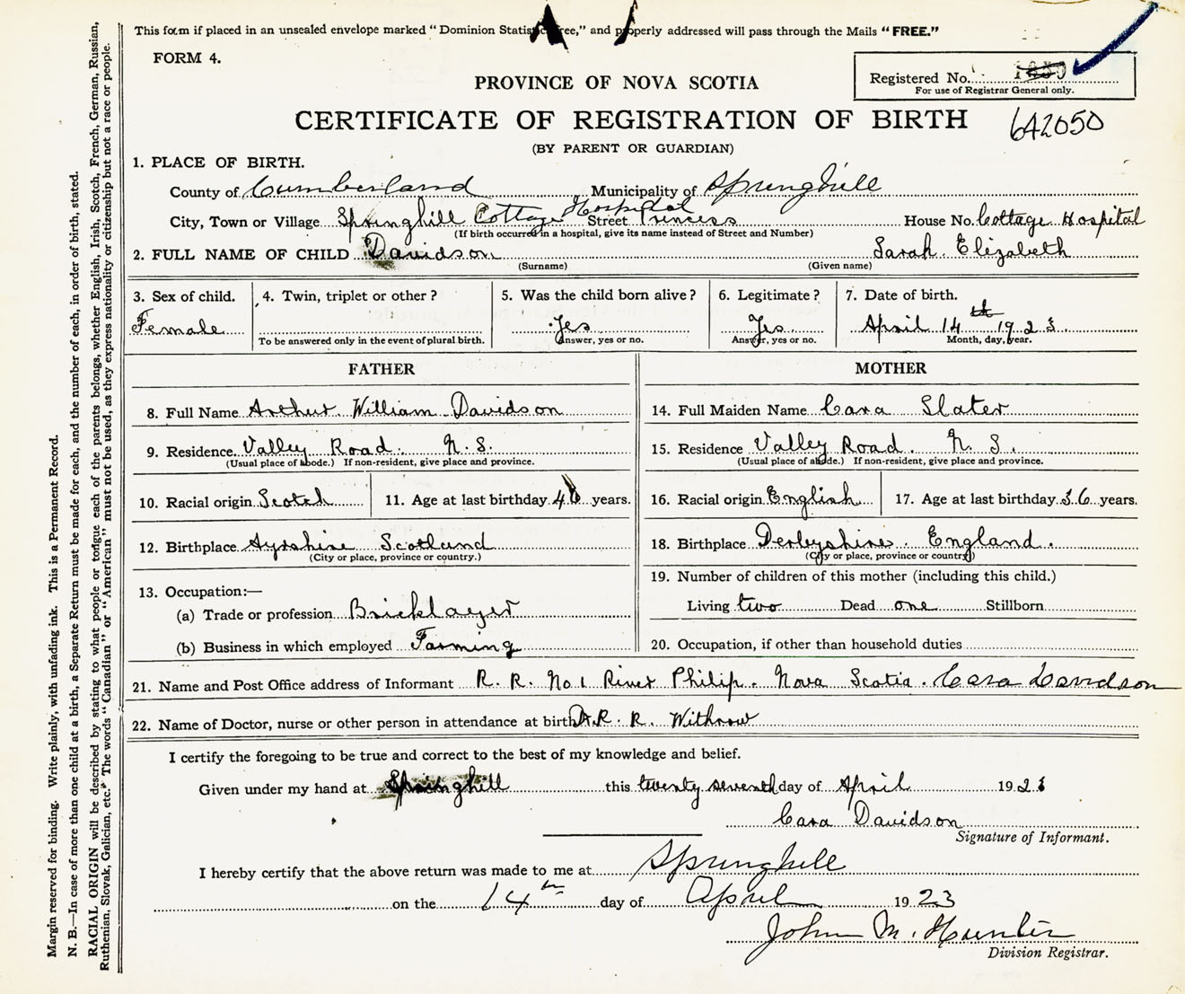 Female Birth Registration: Year: 1923 number: 64200050