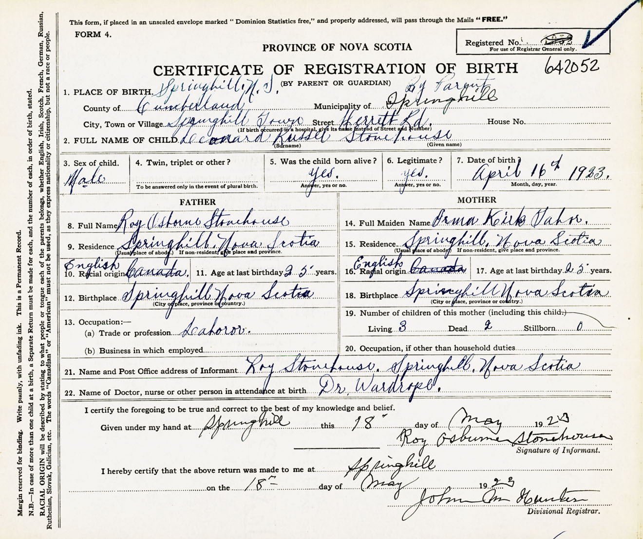 Male Birth Registration: Year: 1923 number: 64200052